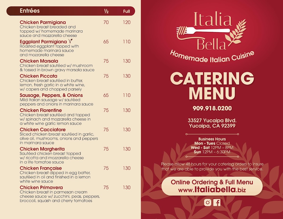 Welcome to Italia Bella, a charming restaurant located at 33527 Yucaipa Blvd #C1 in Yucaipa, CA. This delightful culinary haven promises an authentic Italian experience that leaves diners craving more. The menu features an enticing array of dishes, from fresh salads like the Antipasto to hearty classics like Baked Meat Lasagna and Vegetable Lasagna Alfredo, each crafted with care and high-quality ingredients.